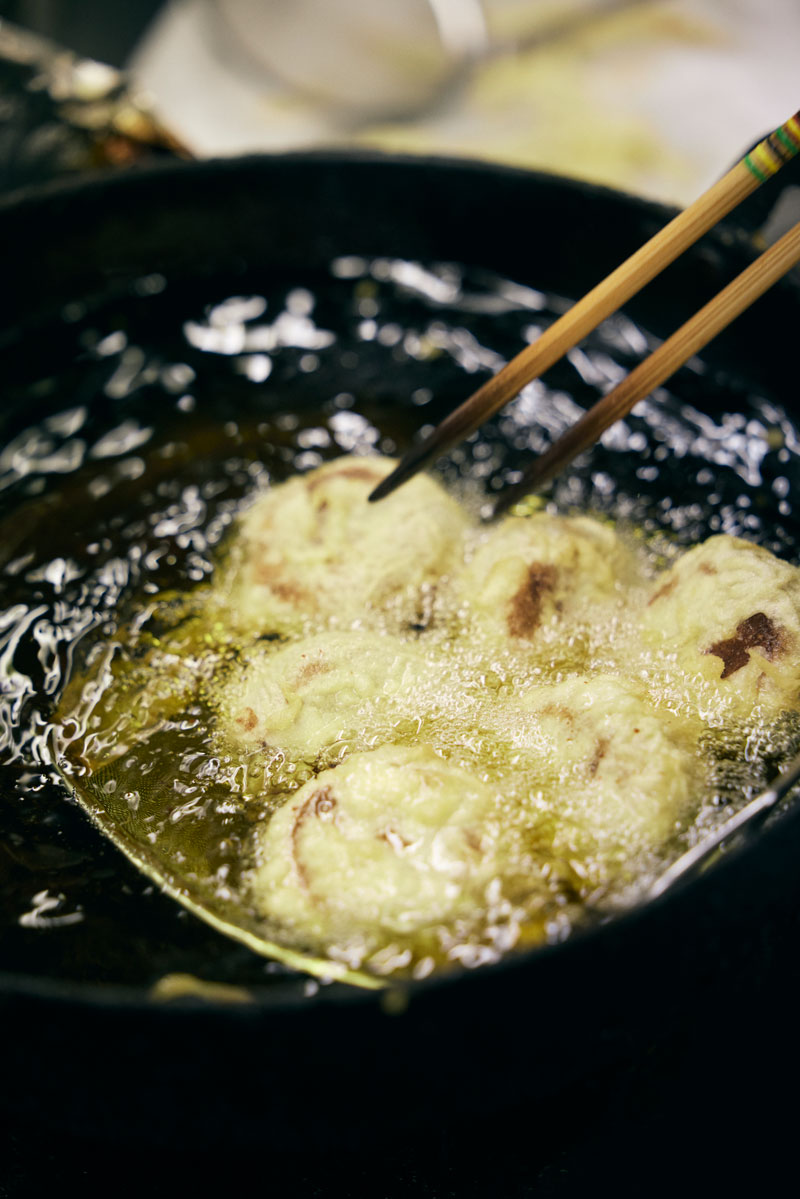 まんじゅうを製造する老舗和菓子屋のひとつ。創業した1830年以来、なんと二百年弱もその製法を代々受け継いでいるのです。自慢の自家製こしあんがたっぷり入った手づくりの倉村まんじゅうが、機械に頼らず手作業で次々に揚げられます。