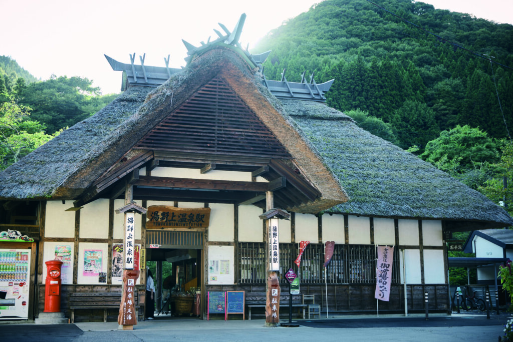 茅葺屋根が特徴の駅舎をくぐると、豊かな自然がお出迎えしてくれるのどかな場所で、天然温泉を楽しむことができる。